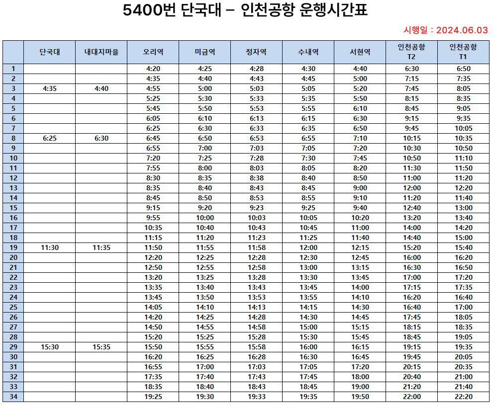 - 단국대 죽전캠퍼스: 첫차 04:40 / 막차 15:20